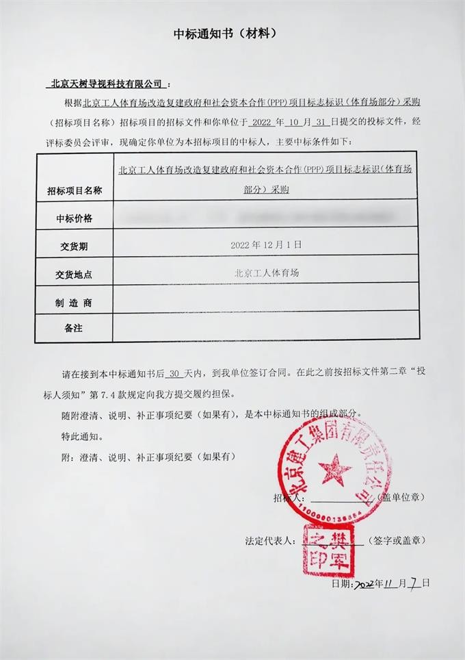 经过激烈的竞争,非常高兴和荣幸,天树取得了最终的胜利,成功中标“北京工人体育场改造复建的标志标识”项目,接下来,我们将全力以赴,劲力同心,完成好本次任务,交付给政府和社会满意的答卷