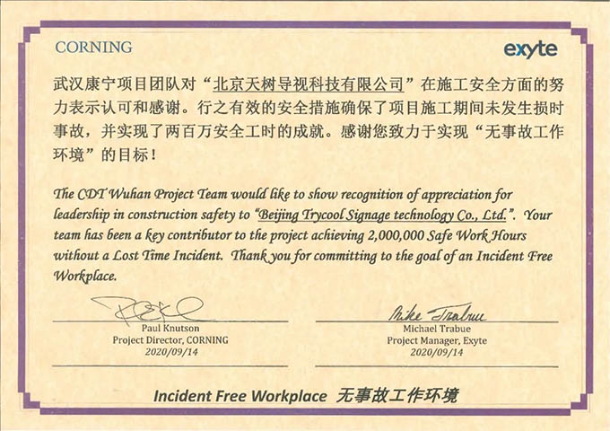 近日,武汉康宁项目团队对我司在项目施工安全方面达到的“无事故工作环境”表达了认可和感谢。