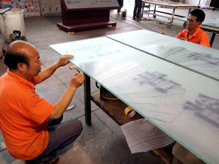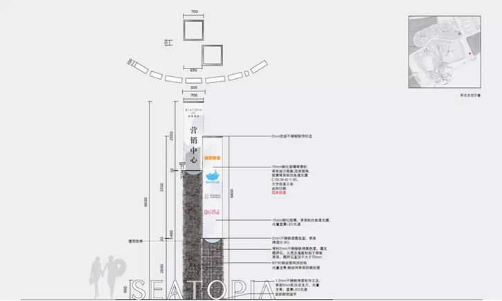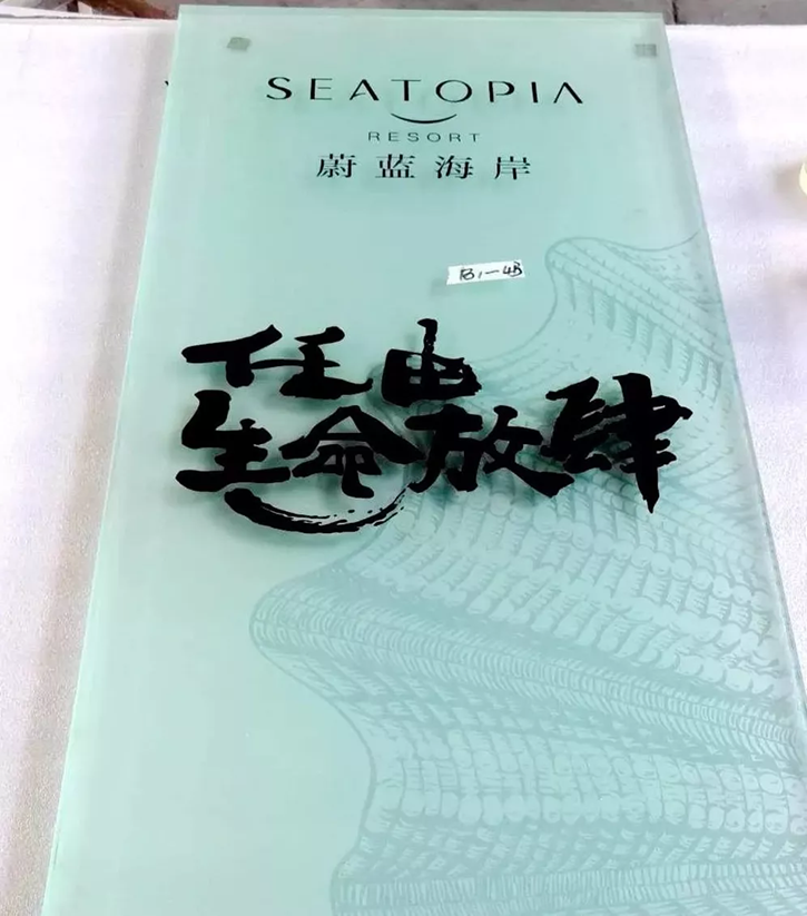 制作工艺使用19mm厚钢化玻璃当背板,将钢化玻璃精磨四边,喷砂处理。标识的底托用直钢丝做网状结构,内詈龙骨钢丝网表面进行防铁处理,内填弃浅米色系鹏卵石,用海星及贝壳点器。我们为选购到大小比例较均匀.外观完整,颜色呈浅米色系的鹅卵石,找了7家石材加工厂,才达到最终的果。