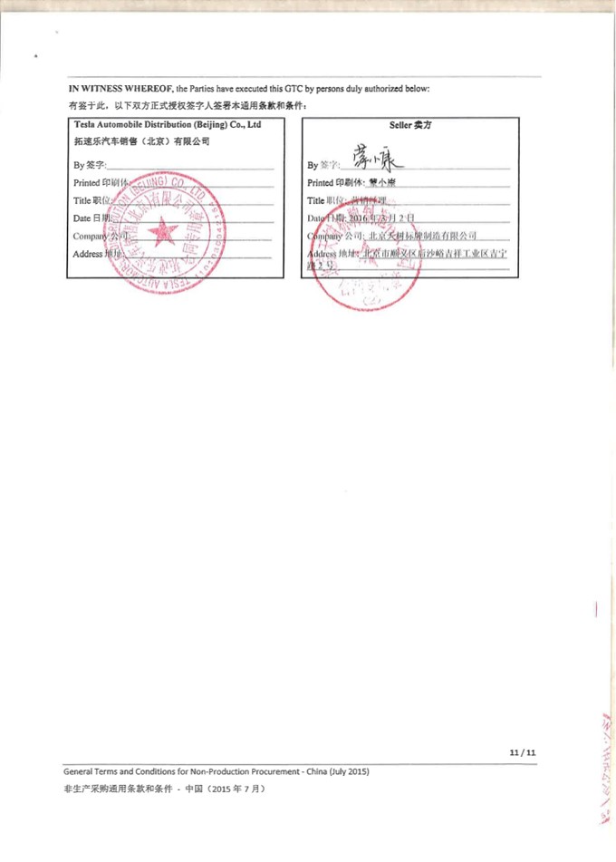 天树公司与特斯拉签订框架协议