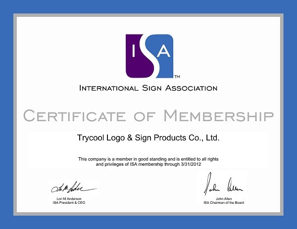 天树标牌十分关注国际标识业的发展,在2011年成功加入国际标识协会(ISA),成为会员企业。
