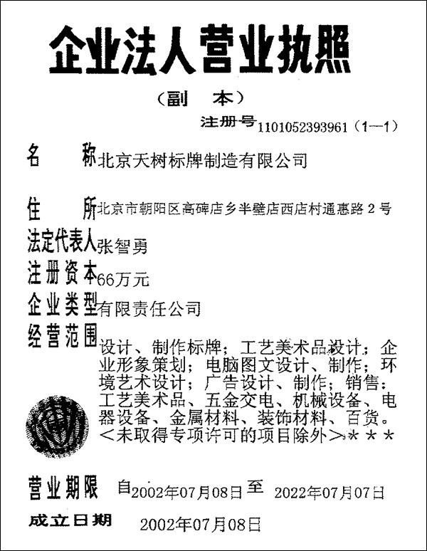 第一家公司的名称是:北京天树文化艺术传播有限责任公司,业务范围十分广泛,经过6年的发展,在标牌领域成就卓越,为此,2002年7月8日北京天树标牌制造有限公司注册成立。成立后,两个公司便有了分工,“天树文化”开始专注于设计,天树标牌主攻加工制造技术,是天树的产品生产基地。