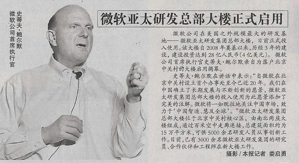 微软公司首席执行官:史蒂夫.鲍尔默为微软亚太研发集团总部大楼揭幕