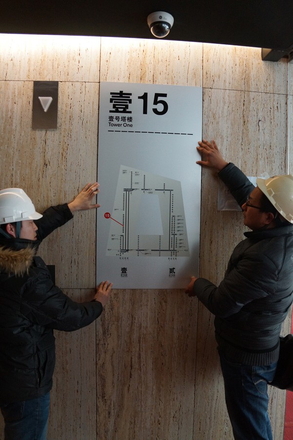 项目组商务人员开始与央视合约部治商签器采购合同,技术人员同央视、建筑设计方OMA、标识设计方2X4与正邦展开了多次设计方案交流会,对样品的材质,工艺及效果进行多次论证,尤其是特殊标识,大家反复考察现场,由我司来完成根据现场点位的实际情况的重新出方案和再确认的工作。
